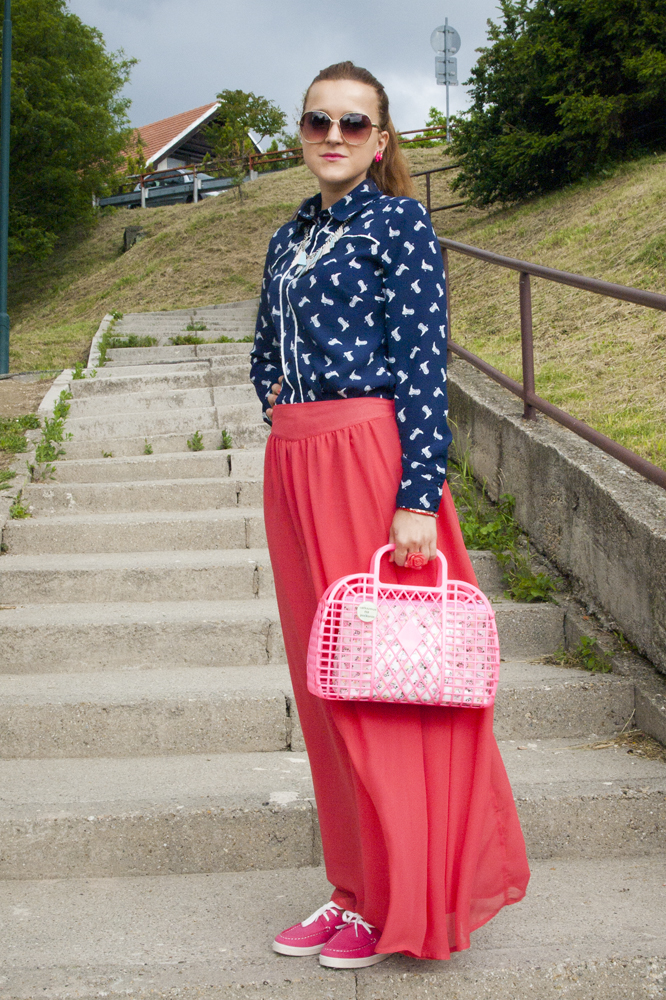 Baša v maxisukni! To tu ešte nebolo ! OK. Toto je foto trošku staršieho dáta (z Urbanmarketu) a ťažko sa mi dnes verí, že mi v tomto outfite bola zima! Neverím. Podľa mňa bolo stále takto. Tridsať stupňov, otvorené sandálky, tony zmrzliny, červené melóny, nové slnečné okuliare, letné čítanie, žabky s potlačou nanukov... Na lete je super, že farebné kombinácie sú prijateľnejšie a nositeľnejšie ako kedykoľvek inokedy. A nad vtipnými kabelkami sa nikto nepozastavuje - prehľadajte povaly a garáže, pretože keď som si túto kabelku kupovala, pani, ktorá stála v rade za mnou zašepkala svojej dcére "Aj ty si takú mala u babky"...